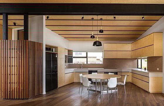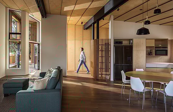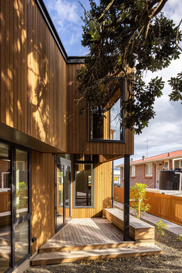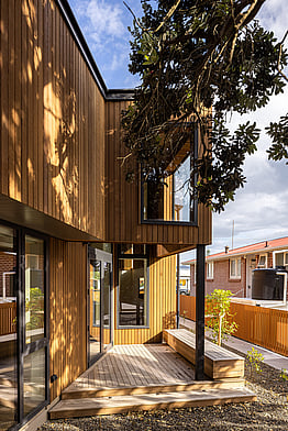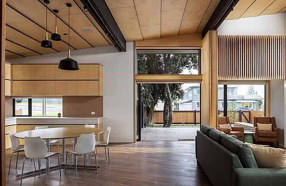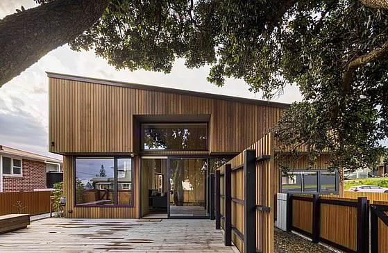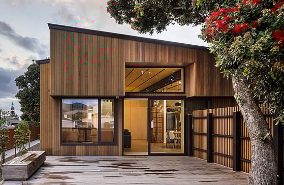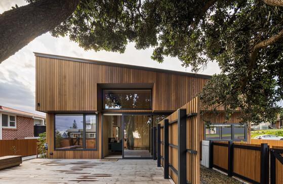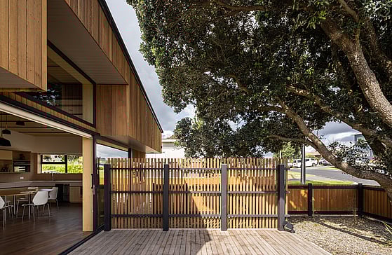 While a two-storey design could have maximised potential views, this was ruled out on the basis of protecting the existing trees and to avoid obstructing views from other properties further up the street. Instead, the cropped building form defers to the living canopy over outdoor areas to the north and east, minimising the need for extended roofs or shading, and letting the pōhutukawa remain the stars of the show.
