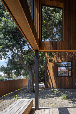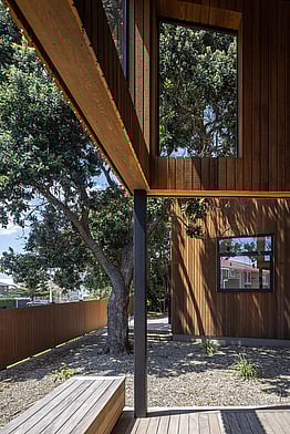 A simple, single-storey, ‘lean-to’ construction form continues the kiwi bach vernacular of the surrounding neighbourhood, with the architecture zig-zagging under the pōhutukawa canopy. The focal point of the house is the northern deck and the opportunity for relaxed outdoor living under the trees.