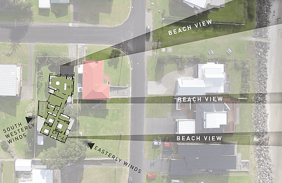 Views east to the sea are glimpses taken between beach-front houses and past another house at the north-eastern corner of the site. The sun-facing deck at the north end of the site pulls the house on ‘tip-toe’ beyond the neighbouring house to take in the sea view.