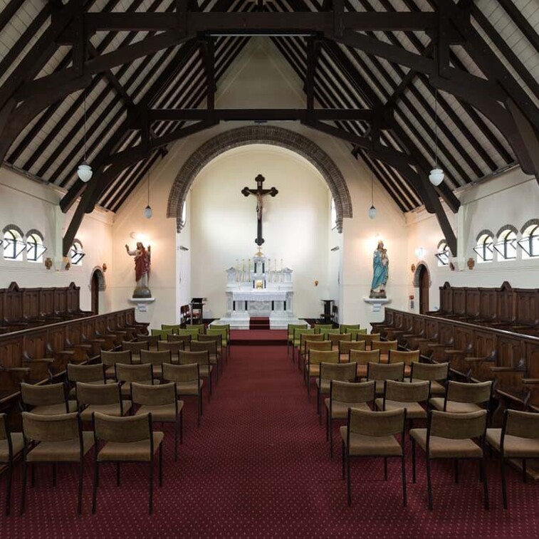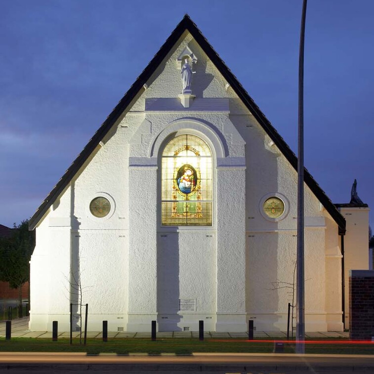 The restoration included the design of a new accessibility ramp and detailing of the new hand-forged steel hand rail, and new planters and hard landscaping around the base and entrance of the building. A new gate was installed in front of the chapel, as a replica of the gate that stood in front of Euphrasie House. The inscription above the gateway reads ‘Institute de Notre Dame des Missions’. A statue of St Mary (from the demolished Euphrasie House) was installed in an existing niche in the south wall. This, along with the addition of LED spotlights to the stained glass rose windows, have enhanced the building's street presence and highlighted the architectural beauty of this beautiful heritage asset.