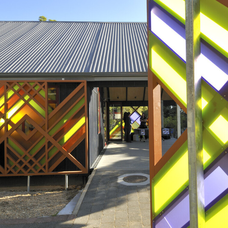 There is more colour, texture and contemporary appeal outdoors where rainbow-coloured “woven” screens draw the eye: Mauriohooho has placed these exterior screens adjacent to the windows, and they are reminiscent of traditional woven tukutuku panels. Constructed from timber and brilliantly coloured perspex, they are decorative as well as functional; they offer privacy, filter the morning sun and western light, and add to Te Āhurutanga's distinctive new charm. “On a sunny day, you observe wonderful patterns of light washing through the perspex screens, which give the appearance of a stained glass window,” Mauriohooho says.