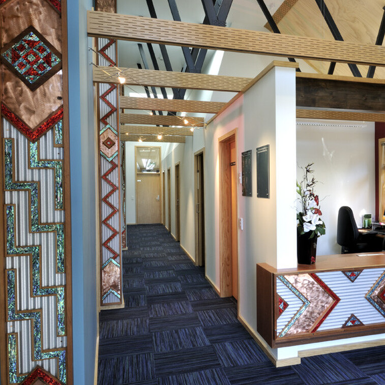 Stunning contemporary artwork by James Webster was commissioned for the project. Webster's panels also offer a contemporary interpretation on traditional Māori artwork, in keeping with Te Āhurutanga's new look and purpose. They are constructed with baby corrugated iron, recycled copper and paua laminate with native timber framing, and each tells a story linked to education themes. Webster's artwork is placed at each of the steps in the hall walls, providing a feeling of regular pou as seen in a traditional whare.