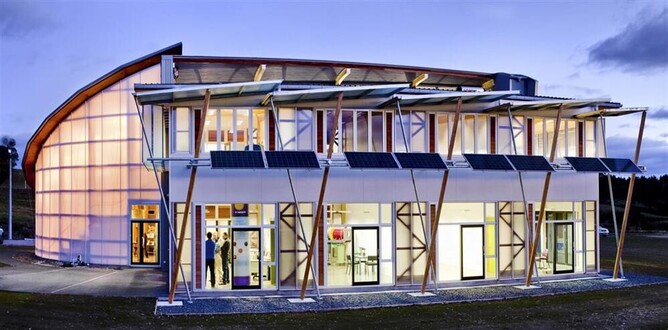 The NZ Clean Energy Centre at Taupo commenced as an invited design competition, with a brief for a sustainable, iconic building as a research and innovation hub, showcasing the clean energy technologies available in the central plateau area, including geothermal, hydro-electric, wind, and bio-fuel-based power.