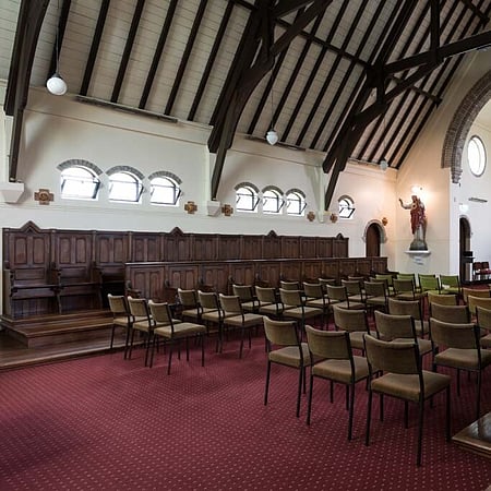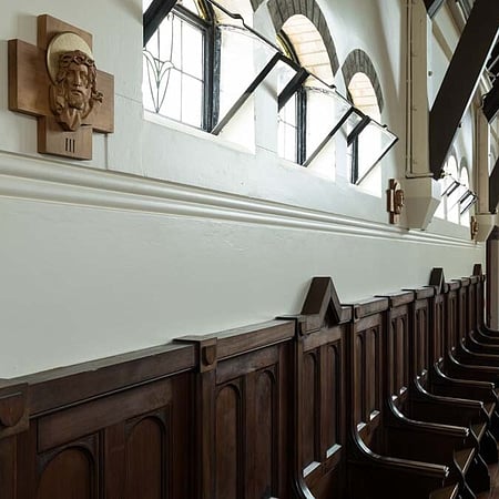 The restoration included the design of a new accessibility ramp and detailing of the new hand-forged steel hand rail, and new planters and hard landscaping around the base and entrance of the building. A new gate was installed in front of the chapel, as a replica of the gate that stood in front of Euphrasie House. The inscription above the gateway reads ‘Institute de Notre Dame des Missions’. A statue of St Mary (from the demolished Euphrasie House) was installed in an existing niche in the south wall. This, along with the addition of LED spotlights to the stained glass rose windows, have enhanced the building's street presence and highlighted the architectural beauty of this beautiful heritage asset.