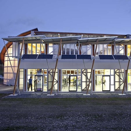 Initially housing and promoting clean energy companies, the building incorporates photo-voltaics, solar hot water, passive ventilation, ground-source and passive solar heating, rain water collection, grey-water recycling, concrete with recycled content, and straw bale insulation.