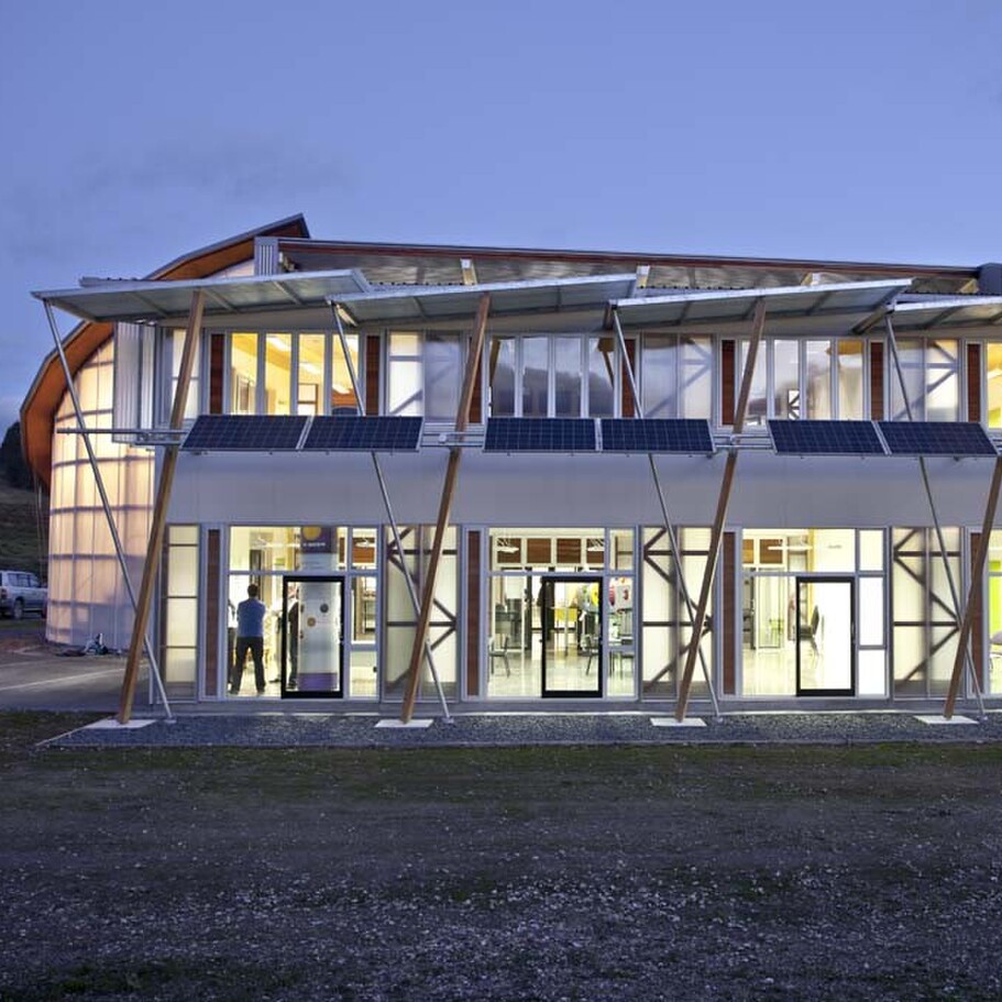 Initially housing and promoting clean energy companies, the building incorporates photo-voltaics, solar hot water, passive ventilation, ground-source and passive solar heating, rain water collection, grey-water recycling, concrete with recycled content, and straw bale insulation.