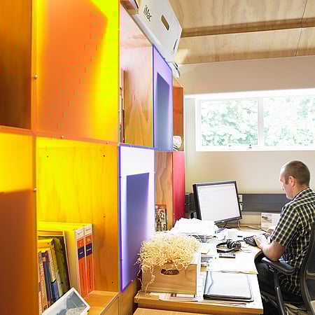 We also designed an expansion into unused space alongside in 2009, and in 2013 a further expansion was achieved by adding a continuous bench running around two sides of the glass atrium wall, with individual power, data and lighting for thirteen casual ‘hot desking’ users.