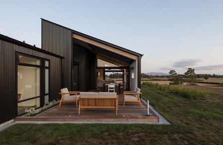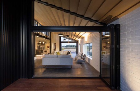 Corrugated coloursteel cladding references the nearby farm buildings and provides a low maintenance finish. Exterior materials are used on the interior, with ‘bagged finished’ brickwork for the walls, and timber ‘weatherboards’ for the ceiling. Outdoor living spaces extend at either end of the living area, sheltered by overhanging roofs.