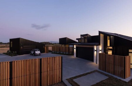 "This home is conceived as a collection of rural forms arranged on a hilltop to align with strong and compelling views to Pirongia and Maungatautari. This assemblage also allows a rich variety of space within and between the shed forms. Site exposure is mitigated, and opportunities created to open or close the house according to the season and weather. Robust materials in black and white are softened by timber landscape screens, and textured plywood ceiling detail. The main living pavilion allows sunlight to filter through a full-length clerestory and fall on the thermal mass of interior brick cladding. A warm and inviting space is created within the hard-line industrial shell. The design is both a bold response to a particular site, and a sensitive solution to dwelling there."