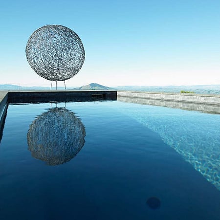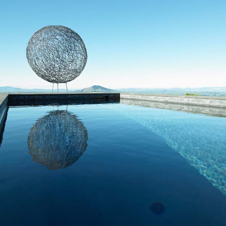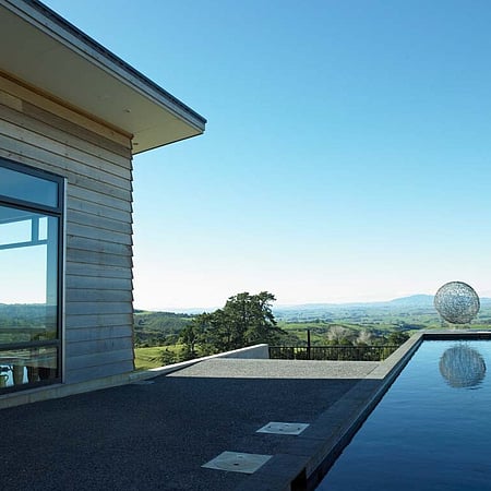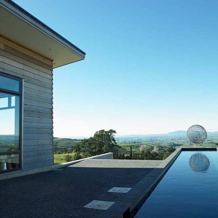 A sheltered courtyard is located on the lee of the dwelling, creating outdoor living on those days when the westerly wind sweeps the landscape. Views over the Waikato are anchored by a fifteen metre lap pool that incorporates a sculpture at its furthest extent.