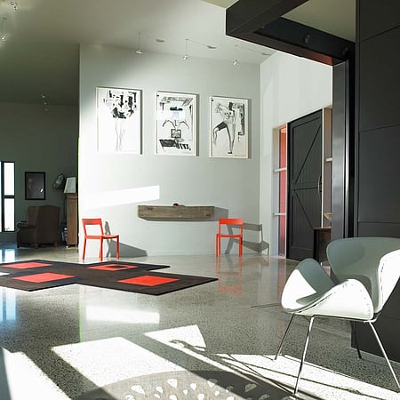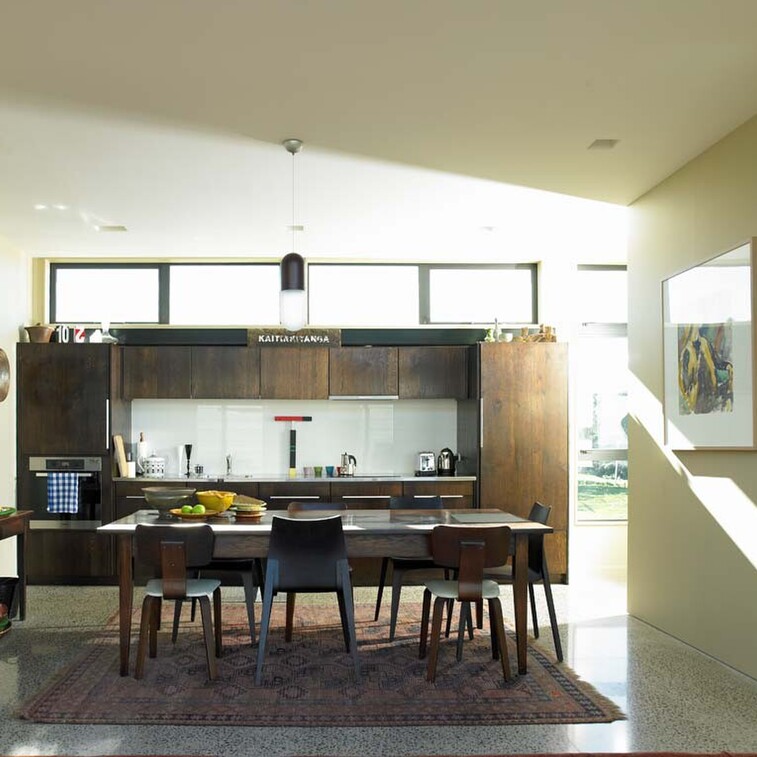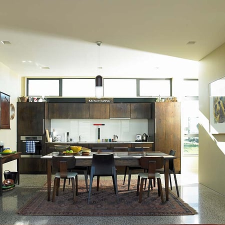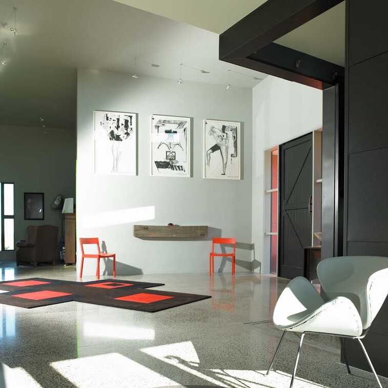 The house has been designed such that it suits the particular requirements of the current owner, but also has adaptability designed in for any future owners. An office that currently opens onto the gallery space has been designed so it can be closed off completely and used as a third bedroom in the future. The minimalist kitchen has been designed to accommodate a future central bench; plumbing has been installed below the slab to allow the bench to be installed without cutting the heated, polished concrete floor.