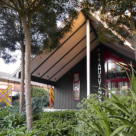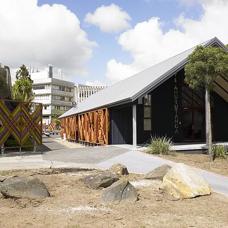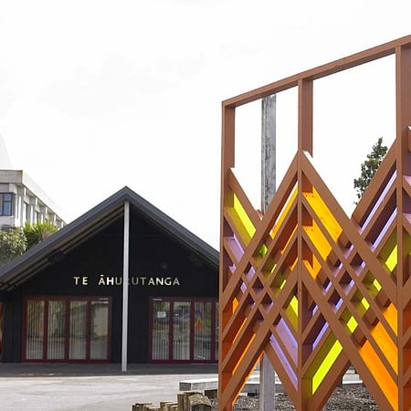 Te Āhurutanga is in a class of its own on the Waikato University campus. The single-storey cedar building with its steeply pitched roof and deep verandas has the unmistakable air of a Māori whare, and it stands proud and colourful among the neighbouring buildings. Te Āhurutanga has recently begun a new chapter in its campus history and it has a new look to complement the change of status, a look that weaves together its past and present roles and offers a creative environment for those who work there.