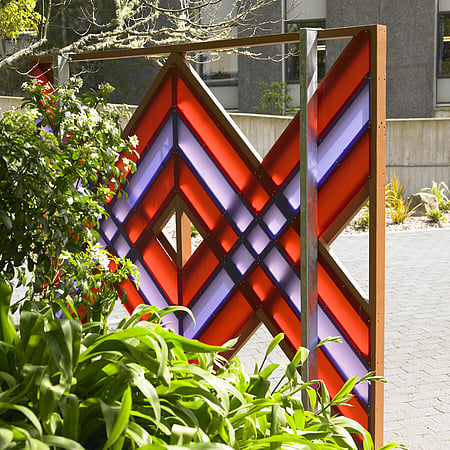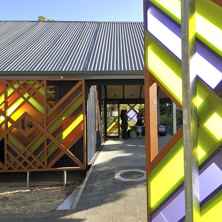 There is more colour, texture and contemporary appeal outdoors where rainbow-coloured “woven” screens draw the eye: Mauriohooho has placed these exterior screens adjacent to the windows, and they are reminiscent of traditional woven tukutuku panels. Constructed from timber and brilliantly coloured perspex, they are decorative as well as functional; they offer privacy, filter the morning sun and western light, and add to Te Āhurutanga's distinctive new charm. “On a sunny day, you observe wonderful patterns of light washing through the perspex screens, which give the appearance of a stained glass window,” Mauriohooho says.